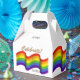 Esta Caixa de Favoritos PRIDE THEMED apresenta o sinalizador LGBTQ. No painel frontal e traseiro, o texto diz "Celebrar!". O painel frontal tem uma área para texto personalizado.