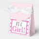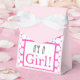 Celebre sua chegada com esse festivo chá de fraldas a favor das bolsas. Esta design apresenta o texto "É uma Rapariga!" em cores de preto e rosa com um fundo de círculo rosa e branco.