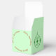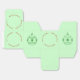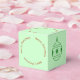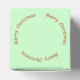 Ornamento de árvore nos lados com um design verde. No topo, frente e verso está um círculo de texto vermelho - repetindo "Feliz Natal". Fundo de verde pálido.