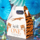 Para o pequeno que comemora seu marco no primeiro aniversário. Os animais de safari 'Selvagem Um', tigre, temem a caixa de favor de aniversário. Facilmente personalizado com a inclusão do nome e dos detalhes do evento. Seu texto escolhido aparecerá na frente e atrás da caixa de favor. Para o pequeno selvagem que ama tigres.