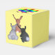 Três coelhos coelhos na frente e atrás. Coelhinho castanho parado na frente, branco e coelhinhos de cinza atrás dela. A frente da caixa mostra os coelhos, a parte traseira da caixa mostra-os. Na parte superior da caixa estão quatro ovos listrados com arco-íris com o texto "Felz pascoa" curvo acima.