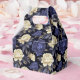 Caixa de guloseimas para festa é mostrada com uma linda estampa floral de peônias multicoloridas em azul.
