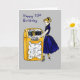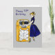 Uma jovem moça desenhada com uma cauda de pônei e calçados de sela, tocando uma Juke Box. Cartão bonito para desejar a uma pessoa mais velha de 70 anos, um feliz aniversário.