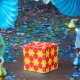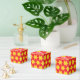 Caixa de presente vermelha e amarela com padrão de estrela cadente. Ideal para preencher favores de aniversário e obrigado ou para outros eventos gerais. Personalize com seus obrigados e o nome na parte superior da caixa. Design por Sarah Trett.