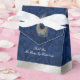 Caixa de presentes da festa de casamento elegante feita em azul na cor damasco azul, com gráficos de uma banda de tom prateado, na parte inferior e uma pena de pavão, na aba. Personalize o texto da cinza leve para atender às suas necessidades de casamento. Um toque perfeito para qualquer pequeno presente que você dá à sua festa de casamento ou convidados.
