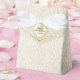 Caixa de presente de rico de presente feita em uma cor damasco de champanhe Fleur, com borda de tom de ouro, na flape frontal. Gráficos de um botão de aparência brilhante colorido de champanhe, no flap, tem texto de script de cinza pronto para personalizar. Uma caixinha adorável para doces e qualquer outra coisa que queiras dar aos teus convidados.