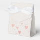 Uma caixa de favor delicada e minimalista com padrões de coração rosa delicados em um fundo claro e neutro.