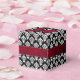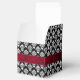Caixa de favoritos elegante feita em uma cor damasco preta e branca, com gráficos de um arco vermelho-rubi com aspecto de cebola, no topo, e fita, no meio da caixa. Uma caixinha adorável para doces e qualquer outra coisa que queiras dar aos teus convidados.