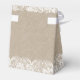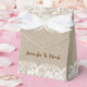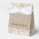 Textura de burlap de linen bege natural e elegante lugar floral branco tradicional, modelo de caixa de presentes de casamento. Sugestão de texto branco e castanho escuro