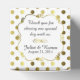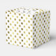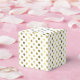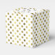 Caixa de favorecimento elegante feita em um padrão de bolinhas de tom dourado, num fundo branco. O topo da caixa tem uma placa decorativa de ouro e texto branco, com texto preto personalizado pronto para personalizar. Uma caixinha adorável para doces e qualquer outra coisa que queiras dar aos teus convidados.