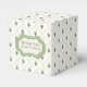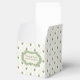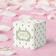 Bonito caixa de presentes verde, marfim e favorito de casamento branco com um padrão de latência, com flores coloridas. Uma placa decorativa verde e marfim, na frente da caixa, tem texto marrom escuro personalizado pronto para personalizar para ler o que você quer.