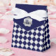 Caixa de presentes favorita do na moda, feita em um padrão quatrefoil azul e branco marinho, com um marinho azul sólido, na aba frontal. Os gráficos de um selo de cera de tom prateado, na aba frontal, têm um monograma azul de uma letra. Excelente caixa de presentes para qualquer ocasião. Personalize o monograma para atender às suas necessidades.