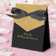 Caixa de presentes de festa de casamento elegante feita em preto-e-jato, com gráficos de um padrão de Fleur amarelo-ouro, na aba frontal. Personalize o texto amarelo ouro, na frente, para ler o que você quer. Um toque perfeito para qualquer pequeno presente que você dá à sua festa de casamento ou convidados.