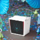 Uma caixa de saída chinesa com um design de abstrato com as cores azul, verde, vermelho e preto. Arte de Angela Rohrig