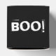 Dê aos seus hóspedes um brinde ou presente nesta caixa. Uma caixa preta com um fantasma branco na frente e atrás. A palavra BOO! em texto branco é colocada no topo para uma surpresa extra. Isso faria a adição perfeita a qualquer festa, evento ou mesmo casamento de Halloween.