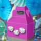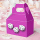 Escolha a sua própria cor para o fundo desta caixa de prêmios de favorecimento de festas de jogos noturnos. Três dados brancos sortudos. Perfeito para Bunco, noite de jogo, noite de casino e eventos temáticos de Las Vegas.