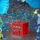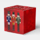 CAIXA FAVOR DO Trio-PARTIDÁRIO Natal, estilo de caixa quadrada - Três Nozes-Nozes sentados lado a lado em cima de um padrão de livro de Natal vermelho. O primeiro pregador está vestido de azul e branco com embelezamentos de ouro. O pregador central está vestido de vermelho e ouro com embelezamentos de ouro. O terceiro preguiçoso está vestido de verde e branco com embelezamentos prateados. Os piratas estão nos lados frontal e traseiro da caixa. Uma imagem dourada que diz: Feliz Natal está no topo da caixa juntamente com áreas de texto para personalização. Duas áreas de texto em branco estão no topo para você editar. Personalize as caixas para uma família se reunir, para funcionários da empresa, etc. Exclua ou limpe as áreas de texto se você não as quiser. A imagem de ouro Feliz Natal em cima pode ser deixada como está ou removida por você. O fundo é um padrão vermelho de Natal. Cada um desses piratas está disponível separadamente em vários presentes e produtos Zazzle. Está disponível a coordenação de presentes e suprimentos de partidos Zazzle.