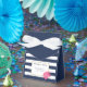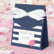 Lindas caixas de favores com fundo azul-marinho e branco-preto, borda falsa dourada e uma bonito pénia rosa em aquarelas moles. Coordena-se com nossos convites e acessórios de Stripe e Peony Rosa de Marinho. Personalize facilmente o nome da noiva e a data do chá.