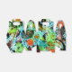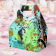 Abstrato em tons vivos de turquesa, lacre, laranja, laranja, vermelho, preto, branco, ouro metálico e tons de verde.