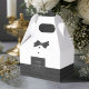 Esta caixa de favoritos ao estilo gable, mostrada aqui com uma doce gravata preta de arco e botões design, tem uma modelo para adicionar facilmente seus próprios nomes e data de casamento. Apresentando gráficos elegantes que ecoam os detalhes refinados de um smoking clássico, essa coleção de casamento inclui elementos como padrões pleados, brancos nítidos e sotaques negros brilhantes para uma vibração personalizada e moderna. Perfeito para casais de dois noivos que amam o ousado minimalismo, este design oferece uma estética sem esforço elegante que é eterno e sofisticada. Procure ID1090 para ver outras peças neste conjunto de casamento coordenado.