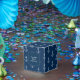 Padrão de âncora em uma caixa de festas azul marinho. Excelente náutico temido para uma festa de chá de fraldas, aniversário de criança ou celebração de casamento.