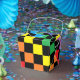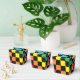 Arte abstrato digital de quadrados coloridos negros e arco-íris em uma formação controlada.