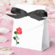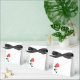 Traga um pouco de elegância para o seu próximo evento. Um simples saco branco amarrado com uma fita de arco preta. O saco tem uma rosa vermelha pequena no canto frontal e uma rosa vermelha maior na parte traseira do saco. Estas farão a adição perfeita a uma mesa lindamente definida cheia de seu especial tratamento para os hóspedes.