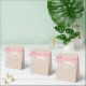 Um saco de chá de panela com faixa de creme bonito embelezada com tulipas cor-de-rosa sobre fundo de aparência bronzeada e texturada. Personalize com o nome da noiva a ser e a data.