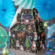 Christmas-themed pattern featuring Santa Claus, reindeer, snowmen, elves, Christmas trees, candy canes, and snowflakes on a black background