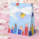 Para uma festa de formatura, essas caixas de favores são decoradas com uma cena de deitar bonés de formatura coloridos no ar, mostrados contra um céu azul com nuvens fofas. O texto diz "Obrigado".