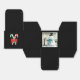Uma pequena caixa favorita de 2 polegadas x 2 polegadas com um desenho bonito com um boneco de neve vestindo um legal chapéu e cachecol. O fundo tem uma linha de pinheiros brancos cobertos de neve. Um par de doces cruzados com um arco no lado de trás.