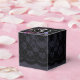 Este design de caixa de favor é perfeito para um casamento gótico moderno e elegante. O design floral temperamental apresenta um buquê natural de flores roxas e lavanda em uma disposição luxuosa em um fundo de renda roxa escura e preta.