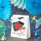 Caixa branca estilo tenda com fita branca com uma imagem de cabaré, na frente e atrás, de um ventilador preto de penas, balão vermelho e preto e uma máscara vermelha. Texto opcional. Sugerimos mudar a fita branca para o cetim vermelho ou preto para um aspecto mais complementar. Veja o convite correspondente, confetti, bolsa de favor, etiqueta de favor, sacos de presentes, adesivo redondo, vinil personalizado e papel de embalagem. Veja toda a coleção da Caixa de Favoritos do Cancan em TOUCHES ESPECIAIS | Seção Favoritos para festas.
