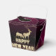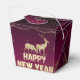 fondo de color cereza degradado con feliz año nuevo en dorado con letra que se desvanece y animal navideño dorado.
