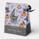 Caixa de lembrança personalizada de "Obrigado" para Chá de Bebê de Halloween/Outono, apresentando carrinhos de bebê desenhados à mão, corvos pretos, chapéus de bruxa, abóboras, teias de aranha e cogumelos minúsculos contra um elegante fundo roxo claro. Impresso na frente e no verso. Basta clicar em "Personalizar este modelo" para inserir seu próprio Evento e Data.