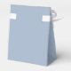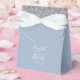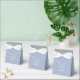 O flape da frente desta elegante caixa de favoritos de casamento moderna apresenta uma borda cintilante de prata. O texto personalizável combina letras brancas e fontes serif sobre um grande e pálido e azul sobre um fundo azul empoeirado.