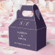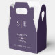Caixa de lembrança de casamento roxa e dourada elegante personalizada com seus nomes, iniciais do monograma e data do casamento. Projetado por Thisisnotme©