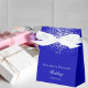Um fundo azul real na moda, decorado com faíscas prateadas falsas. Com o texto: O casamento é escrito com um moderno estilo escrito à mão. Personalize e adicione seus nomes e a data.