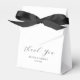 Casamentos minimalistas favorecem caixas com um simples fundo branco, um arco preto, as palavras "obrigado você" em uma letra elegante, seus nomes e a data do casamento.