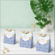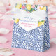 Os limões clássicos modernos de casamento com flores cor-de-rosa favorecem as caixas, contra um fundo de azulejos de safra azul e branca.