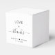 Caixa branca Chic para o seu casamento que apresenta "amor + obrigados" em uma simples tipografia moderna e um roteiro elegante com sucos, seus primeiros nomes unidos por um coração e sua data de casamento.