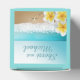 Esta bonito caixa de favores apresenta 3 belíssimas flores de plumeria em uma praia tropical com estrelas-do-mar na areia. Use o botão "Personalizar" para personalizar com seu próprio texto. Convites correspondentes e muitos outros produtos disponíveis. Para perguntas ou solicitações personalizadas, envie um e-mail: cheryl@glamprettyweddings.com/contact. "Plumeria Beach" design original por Cheryl Daniels © 2014.