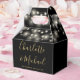 Caixa de favoritos de casamento elegante com luzes de cordas bonito, nomes de guião de dourado chic e data especial em fundo preto. Você pode personalizar com seu próprio obrigado sua mensagem ao contrário. Uma maneira perfeita de dizer obrigado aos seus hóspedes! Projetado por Thisnotme©
