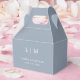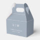 Simples mas elegante Caixa de Favor do Casamento com um design moderno minimalista com seu monograma de duas letras junto com seus nomes e data. Todos os elementos de design estão em branco sobre um fundo azul empoeirado e podem ser alterados na ferramenta de edição de design. Estas Caixas de Favor do Casamento clássicas vão bem com qualquer estilo de casamento.