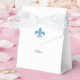Chic e elegante caixa de favoritos de casamento azul francês fleur de lis, padrão merci. Padrão detalhado do canto do pulgão em azul francês. Personalize com sua mensagem em letras escura. Projetado para combinar com a nossa coleção de casamentos da Fleur de Lis, francesa Regência.