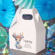 Uma pequena caixa de favor com uma ilustração adorável. Um doce veado com olhos grandes, galhadas e um pequeno amigo da borboleta. design querido.