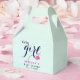 Esta caixa de favoritos para um chá de menina é encantadoramente decorada com uma mistura de tons rosas e azuis marinhos fuchsia. A frase "Menina" é elegantemente mostrada na tipografia azul marinho, dando um toque de sofisticação. Contra um pano de fundo azul macio, uma deliciosa baleia rosa-quente fuchsia brava brinchosamente corações, criando um ambiente caprichoso e delicioso. Para torná-lo único, incorpora-se também o nome da mãe expectante, fazer-a uma recordação apreciada do evento.