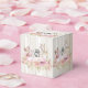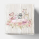 Caixas de lembrança para chá de bebê floresta menina com adoráveis animais de bebê em um banner floral cor-de-rosa e fundo de madeira. Você pode alterar o texto nos banners e adicionar texto conforme necessário.