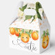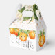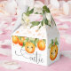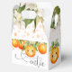 Caixas de lembrancinha de chá de bebê laranja little cutie com carinha fofa em um fundo desfocado laranja e texto Ela é uma Pequena Fofoqueira. Essas caixinhas de lembrancinha de chá de bebê adoráveis podem ser personalizadas com texto.