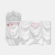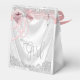 Caixas de lembrança de chá de bebê rosa com cetim branco elegante e pérolas bonitas e laço rosa diamante em um fundo de cetim branco. Você pode adicionar o texto de sua escolha ou excluir todo o texto.